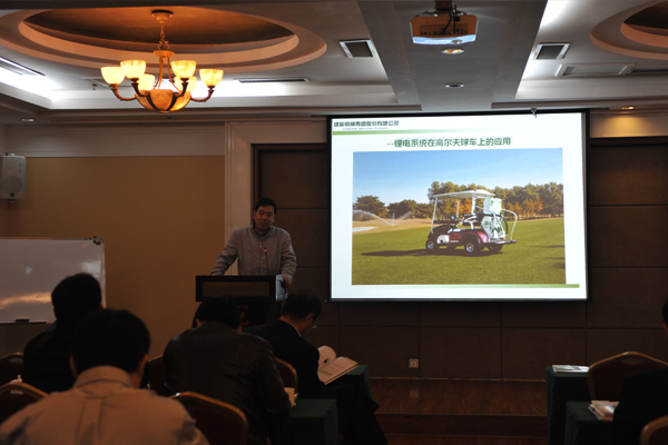 會議第二項內容由綠友集團OHEV事業部張得玉先生匯報鋰電系統在高爾夫球場上的應用。這是個全新的課題,大家聽得非常認真。在高爾夫業內現階段使用的都是鉛酸電池,張得玉先生從鉛酸電池對環境的污染和鉛酸廢舊電池如何處理,以及鉛酸電池性能與鋰電電池性能的巨大差距等幾個方面匯報了行業內目前的狀況。由于鉛酸電池本身性能上有缺陷,使用壽命短,業內以后的發展趨勢一定會向著更加環保、安全和性能卓越方面發展,綠友集團走在了行業的前面。