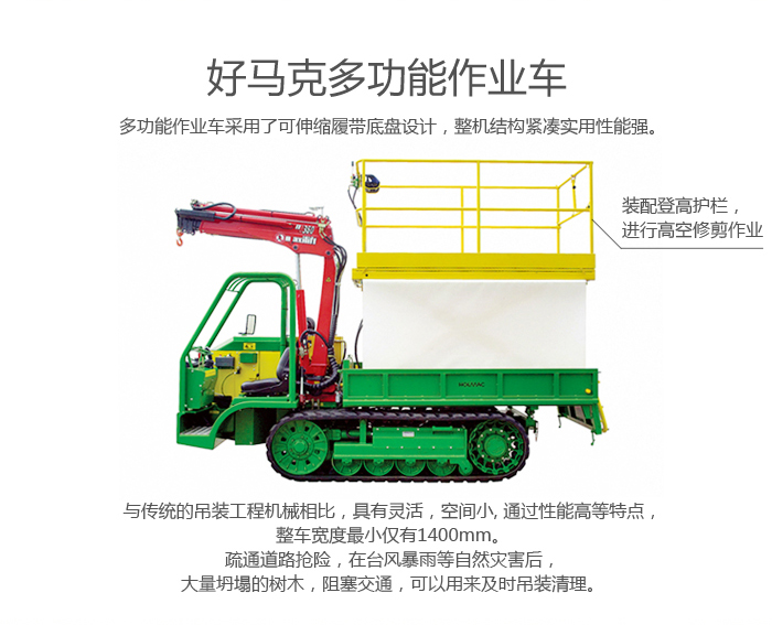 多功能作業(yè)車采用了可伸縮履帶底盤設(shè)計,整機結(jié)構(gòu)緊湊實用性能強。與傳統(tǒng)的吊裝工程機械相比,具有靈活、空間小、通過性能高等特點,整車寬度最小僅有1400mm。同時,履帶式底盤對地面的要求也很低,不用考慮地基的要求。
